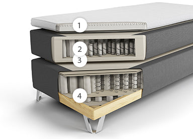 Le J4 est équipé du système de ressorts Aloy® 2.1 (12,5 cm), qui soutient et s’adapte à votre corps. La zone d’épaules, extra souple et allongée, offre une grande flexibilité et un espace optimal pour vos épaules. Le système de ressorts comprend également un soutien intégré pour le bas du dos.
